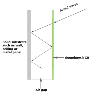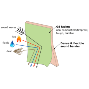 Soundmesh® G8 which is a patented engineered material that is thin and tough with unique acoustic and fireproof properties.